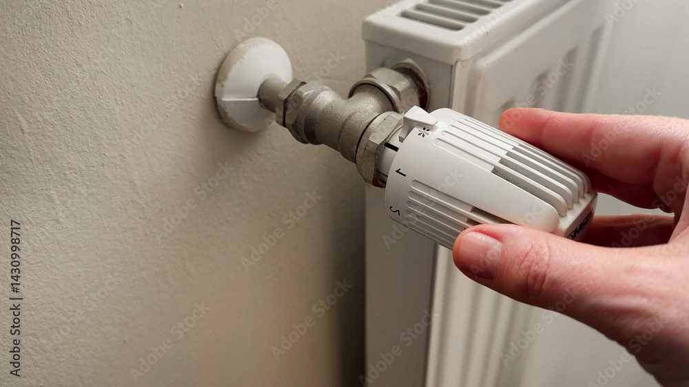 Hand adjusting home radiator thermostat for energy saving, central heating control, winter preparation, Caucasian male, eco-friendly living