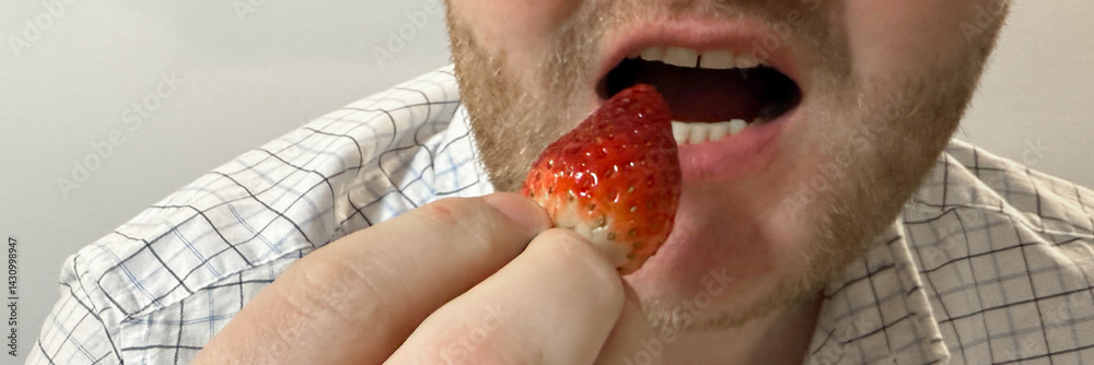 Caucasian man enjoying ripe strawberry, symbolizing fresh summer fruit delights, healthy eating, and romantic Valentine's Day indulgence