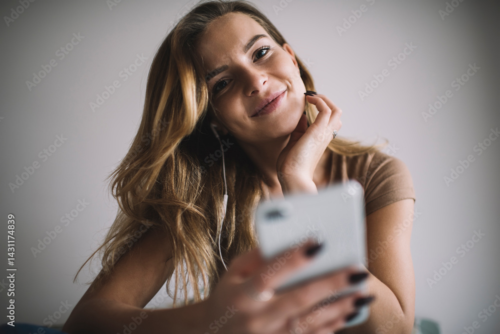 Portrait of pretty hipster girl with cellular technology in hand using wifi internet connection for enjoy music, happy female millennial in electronic headphones listening positive audio songs