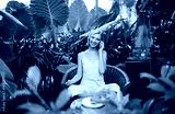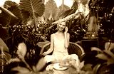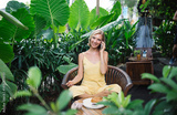 Smiling woman sitting and speaking on smartphone in tropical garden