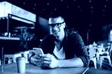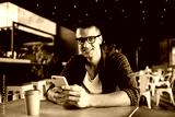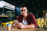 Smiling man in glasses using mobile phone in cafeteria