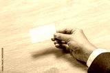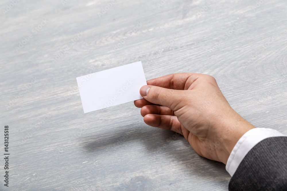 Hand hold blank business card design mockup. Businessman holding visiting card. Business branding template. Person in suit and white shirt.