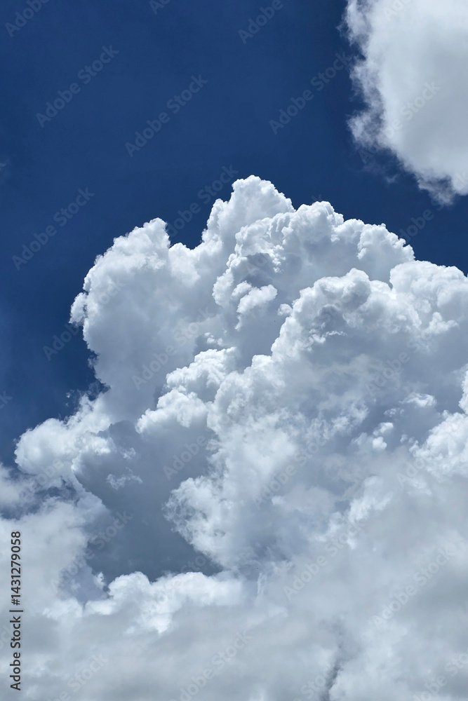 Fluffy white cumulus clouds against a vivid blue sky on a sunny afternoon, showcasing a natural weather phenomenon.