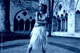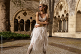 Elegant Fashion Model in Flowing Beige Dress Posing in the City in Summer Sunlight. Urban Fashion.