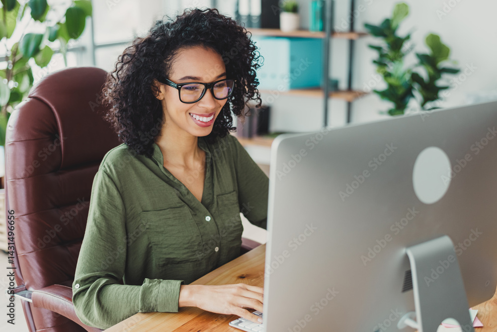 Smiling professional businesswoman working on a computer at a modern office with natural daylight and a casual style setting.