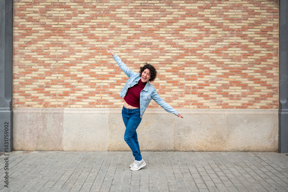 Young woman dancing with open arms in front of brick wall