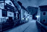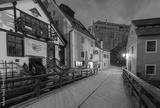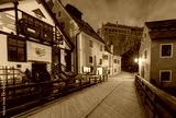Evening view of a cobbled street with historic buildings in Cesky Krumlov, Czech Republic
