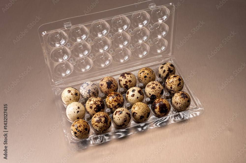 Fresh small spotted partridge or quail bird eggs uncooked in plastic box