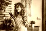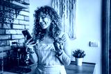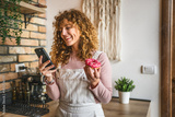 happy woman eat donuts and use mobile phone while stand in the kitchen