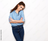 beautiful joyful girl in denim styling on solid background