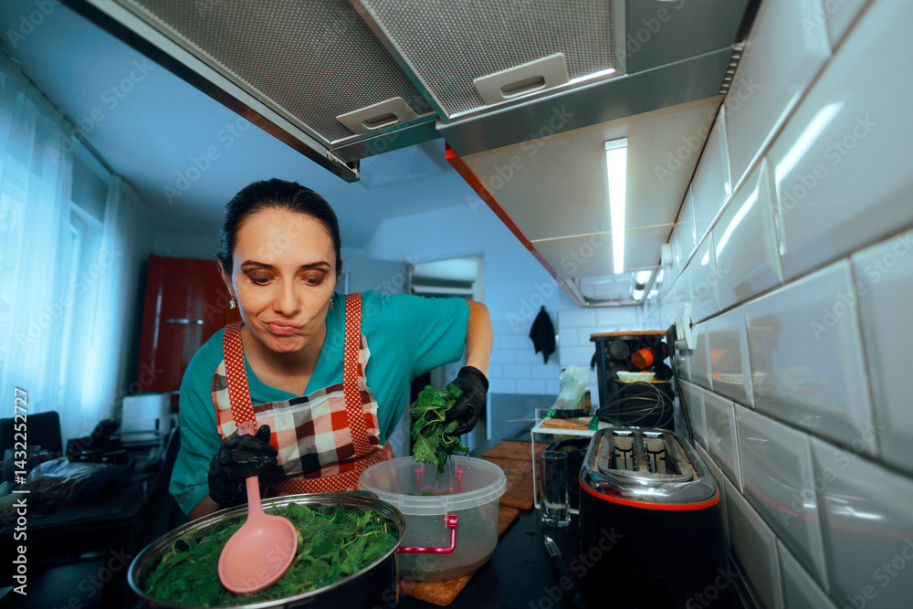 Puzzled Woman Making a Soup from Nettle Following Recipe. Frustrated home cook not knowing how to prepare vegan dish