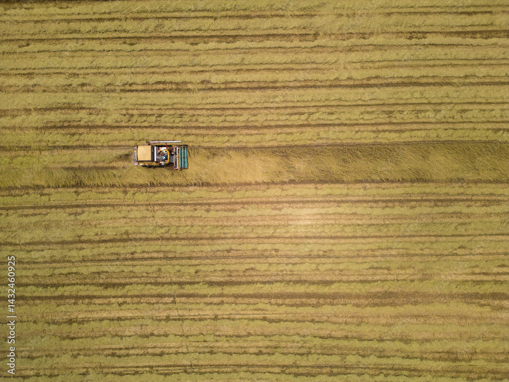 Drone aerial view shows rice harvesting using agricultural machinery to save labor and time.