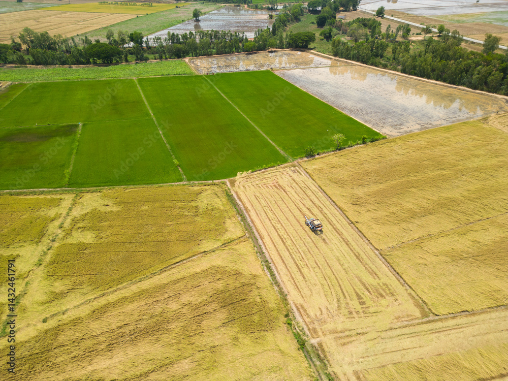Drone aerial view shows rice harvesting using agricultural machinery to save labor and time..