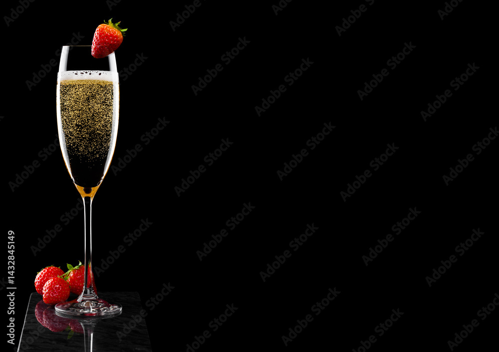 Elegant glass of yellow champagne with strawberry on top and fresh berries on black marble board on black background. Space for text
