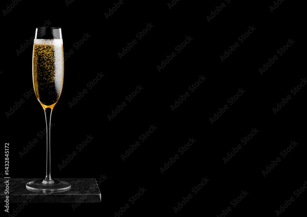 Elegant glass of yellow champagne with bubbles on black marble board on black background. Space for text