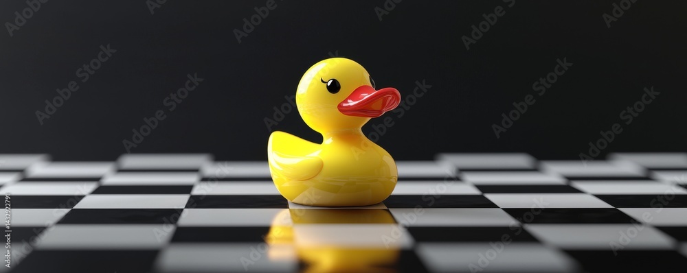 A vibrant yellow rubber duck stands proudly on a checkerboard surface.