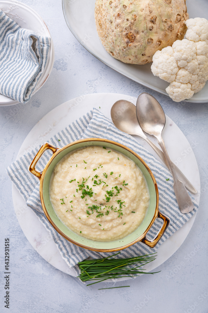 Mashed celery and cauliflower puree with chives, alternative to mashed potatoes