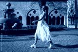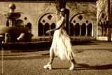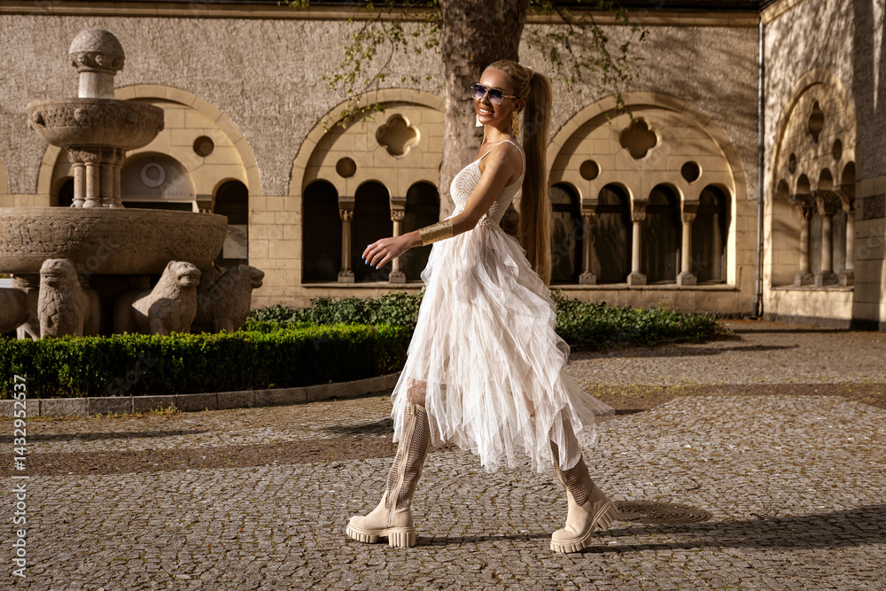 Elegant Fashion Model in Flowing Beige Dress Posing in the City in Summer Sunlight. Urban Fashion.