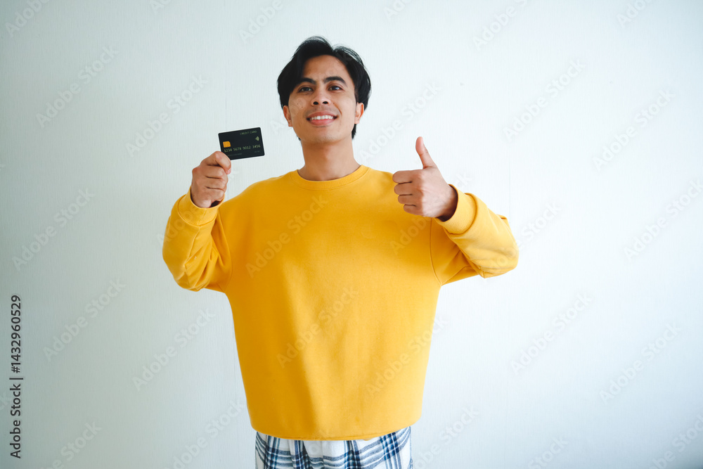 Confident young Asian man smiling while holding a credit or ATM card and showing a thumbs-up gesture