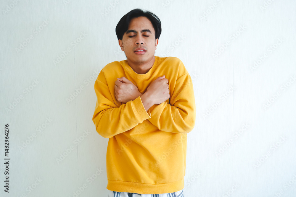 Freezing Asian man crossing arms and closing eyes, shivering from cold, isolated on white background. Sad expression in winter weather.