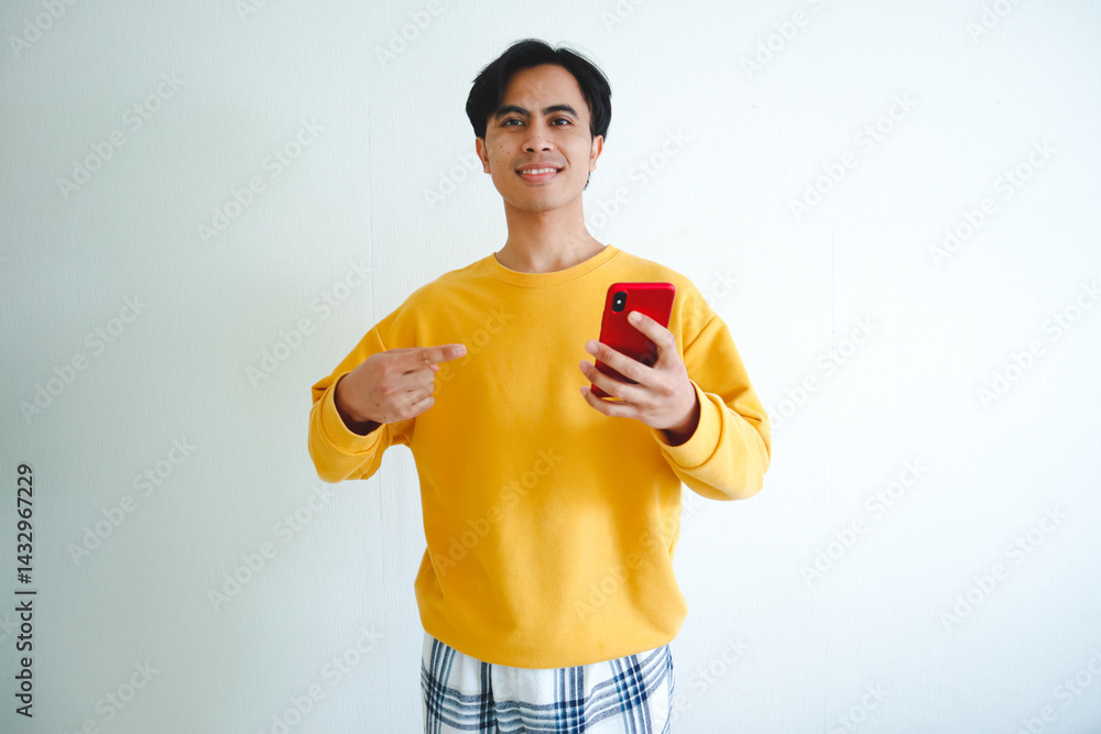 Smiling Asian man pointing at smartphone, presenting or promoting an app or content with happy expression on white background.