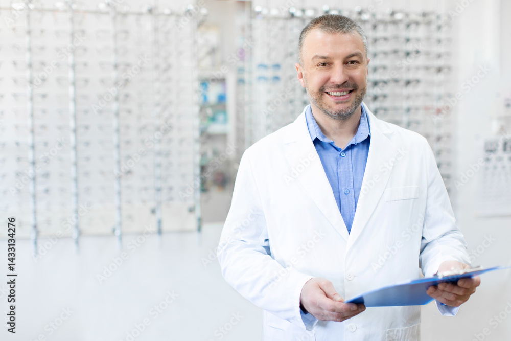 Portrait of middle aged man optometrist with clipboard in hands looking and smiling at camera, working in optics store