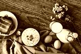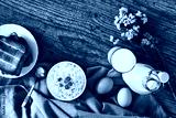 Dairy products on dark wooden table. Sour cream, milk, cheese, egg and Toasts. Top view with copy space