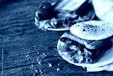 Sandwich with eggs, chicken, cucumber and lettuce on a wooden background. Selective focus. copy space