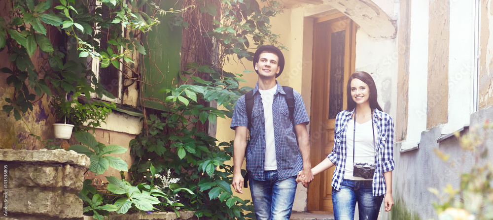 Couple of young travelers: walking around old town. Vacation, summer, holiday, tourism: concept.