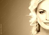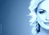 Half part portrait. Beautiful blond girl with luxury golden necklace over blue background.