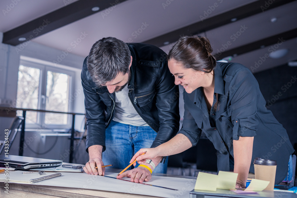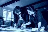 architects people discussing construction project on desk.