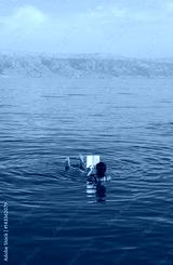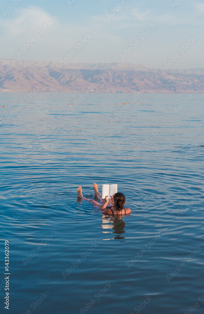 Young woman reads a book floating in the waters of the Dead Sea in Israel