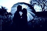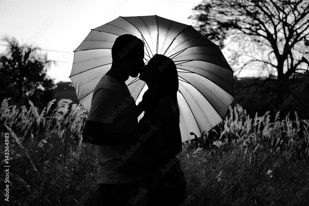 Silhouette of a romantic couple kissing in front of an umbrella. Concept of love and union. Black and white picture.