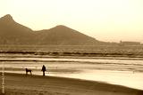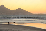Man and dog walking on the beach. Beautiful sunset at Milnerton beach , Cape Town, South Africa.