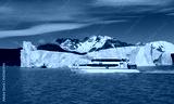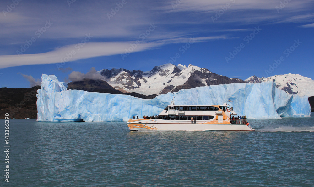 Ship and an iceberg in the background. El Calafate, Patagonia, Argentina