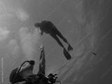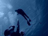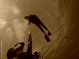 Couple of divers. Hands reaching out to one another, almost touching. Rangiroa, French Polynesia.
