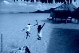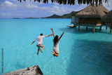 Happiness jump of young couple on the water. Over water bungalows at Bora Bora, French Polynesia.