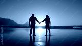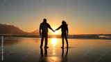Concept of love and happiness. Silhouette of a romantic couple holding hands on the beach at Cape Town city, South Africa. Man and woman enjoying sunset on beach.