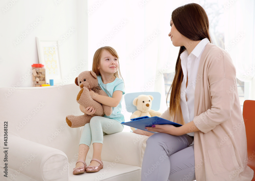 Young child psychologist working with little girl