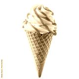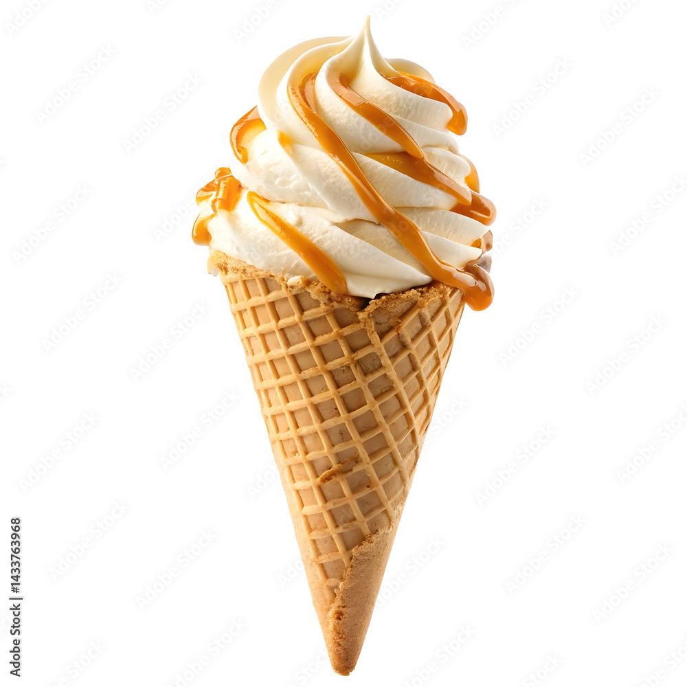 Delicious ice cream cone topped with caramel swirl and whipped cream