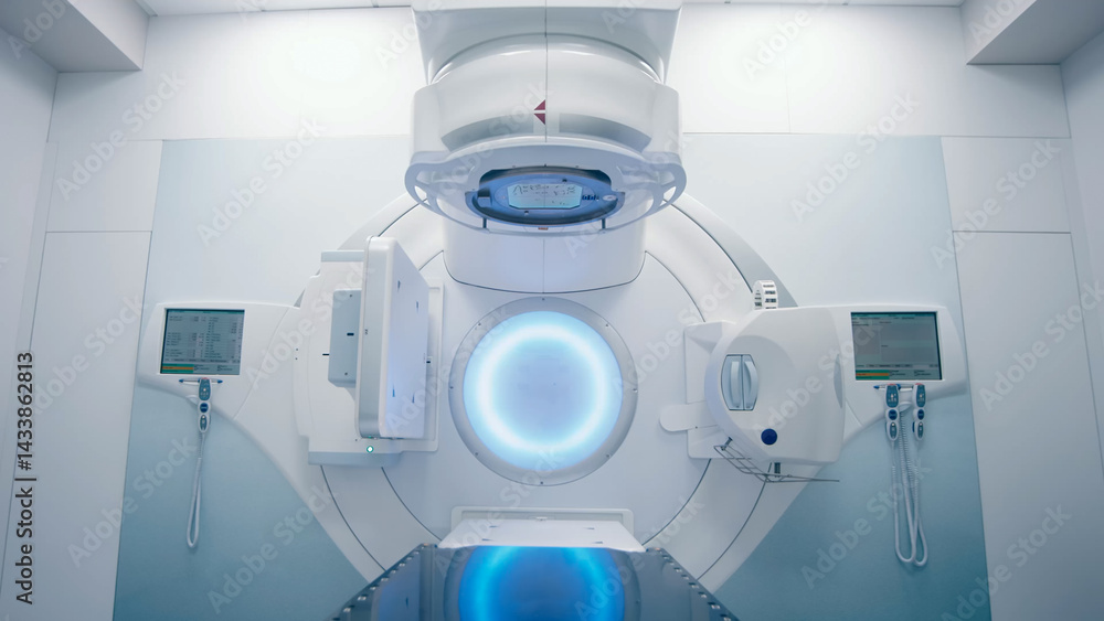 Cancer therapy, state-of-the-art medical linear accelerator in therapeutic oncology. Concept of medical technology and device treatment.