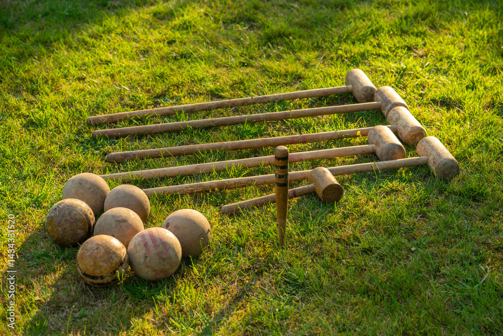 Vintage croquet set with wooden hammers and balls. A Victorian outdoor game in the company.