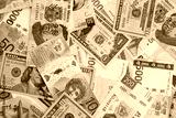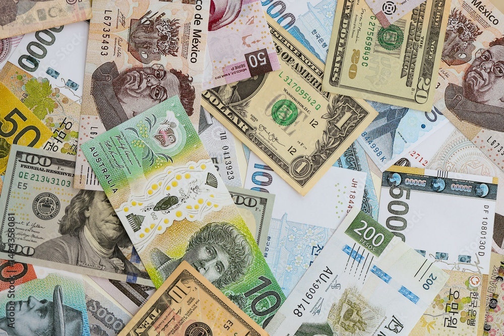 Big amount of money bills of different currencies and countries. Assortment background of international cash in big pile close up