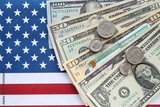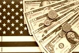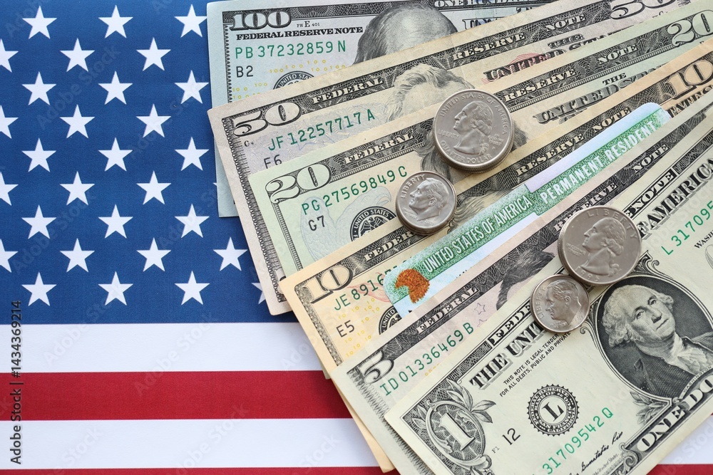 American US dollars money bills, green card on American flag close up