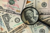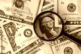 Big amount of United States USD dollar bills and magnifying glass