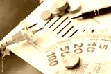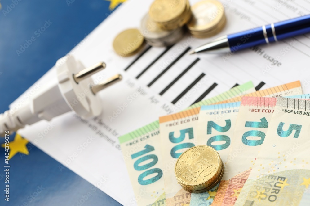 European union Euro money bills and coins with european electricity utility bill on table