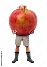 Funny gardener carrying a large red apple. Farmer hold big apple isolated on white background. Successful fruits grower. Large harvest of genetically modified foods.