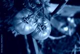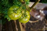 Organic unripe green mortgage tomatoes twig in organic cultivation in the home garden