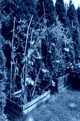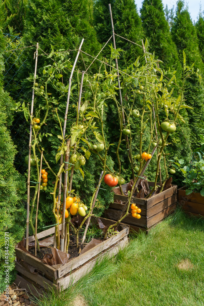 Small home organic tomato farm in wooden boxes naturally fertilized