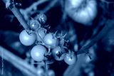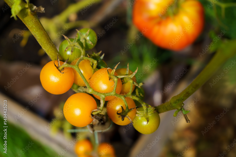 Small orange ripening cherry tomatoes on a bush in an organic home garden
